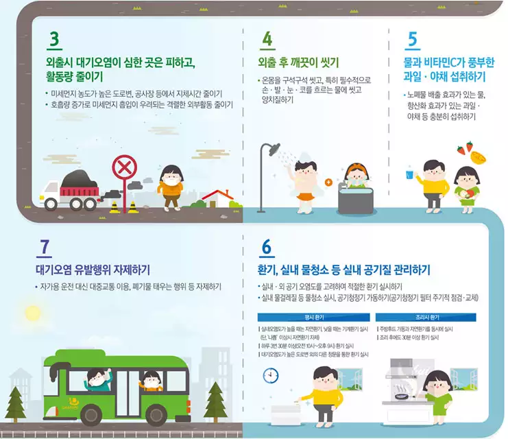 도로변, 공사장 등에서 지체시간 줄이고 격렬한 외부활동도 줄인다. - 외출 후 깨끗이 씻기