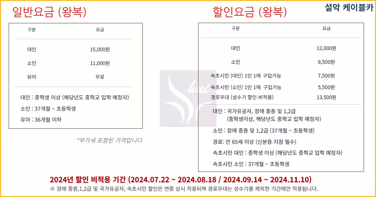 장애 중증 및 1, 2급 및 국가 유공자, 속초시민 할인은 상시 적용되며, 경로 우대는 성수기에 할인 적용에서 제외된다. 2024년 할인이 적용되지 않는 기간은 여름휴가철인 7.22 ~ 8.18과 가을 단풍철인 9.14 ~ 11.10이다.
