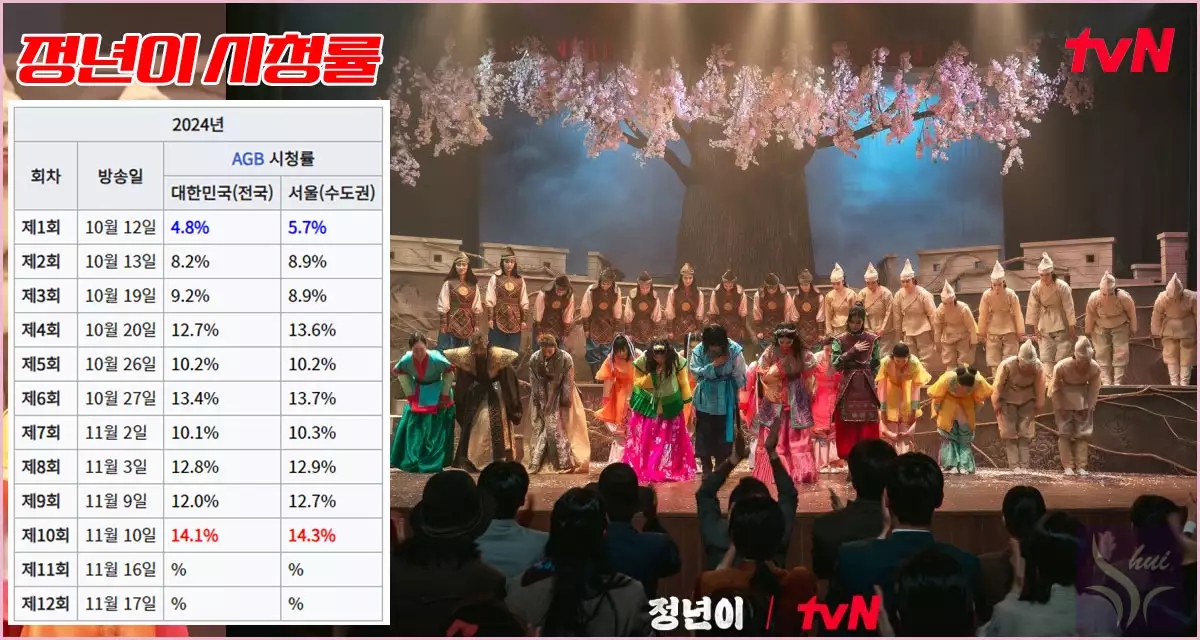 민폐 논란에도 불구하고 드라마 정년이의 시청률은 계속 상승중이다. 11월 10일 10화에는 서울 14.3%, 전국 14.1%를 기록했다. 배우 한 명 한 명이 다년간 노력해 만들어낸 결과물이라는 것을 알기에 이 시청률이 그다지 놀랍지도 않다. 최고의 시청률로 12부작을 마감할 것이라 기대한다.