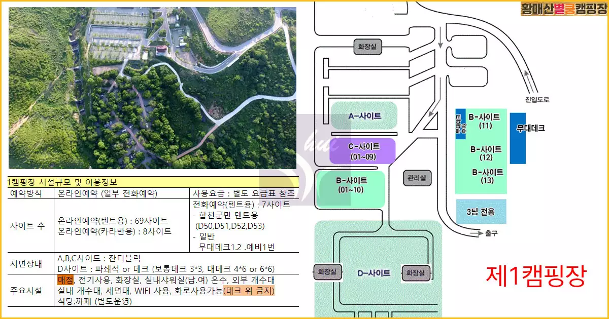 위는 제1캠핑장으로 우측 배치도를 참고로, A, B, C사이트는 잔디블럭이며 D사이트는 파쇄석 또는 데크로 이루어졌다. 보통 데크는 3*3, 큰 데크는 4*6 또는 6*6 사이즈이다.