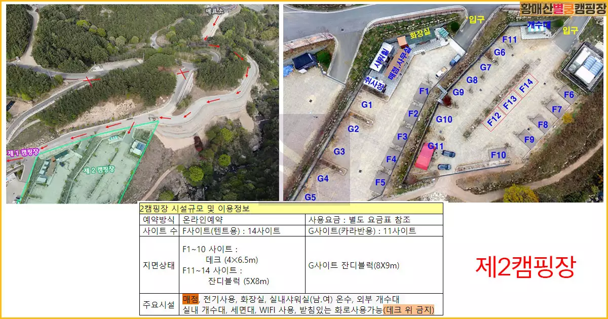 제2 캠핑장은 차량 진입 시 제일 처음 나타나는 곳으로, 텐트용 14 사이트, 카라반용 11 사이트로 구성되었다. 카라반용 사이트의 지면은 모두 잔디블럭(8*9)이며, 텐트용은 데크(4*6.5)와 잔디블럭(5*8)이 혼재한다.