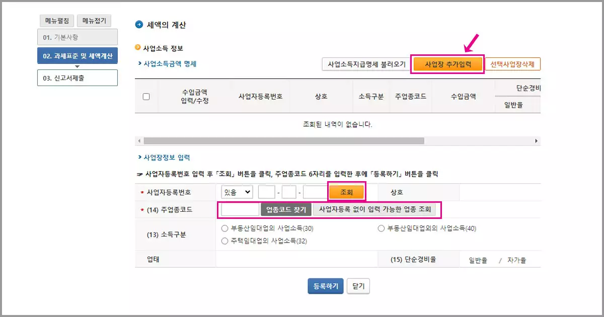 사업소득 정보 입력 화면이다. 우측 상단의 '사업장 추가입력' 버튼을 클릭하면 사업장 정보를 입력할 수 있는 팝업이 뜬다. 항목들을 입력하고 등록하기 버튼을 누르면 사업소득금액 명세에 추가된다.